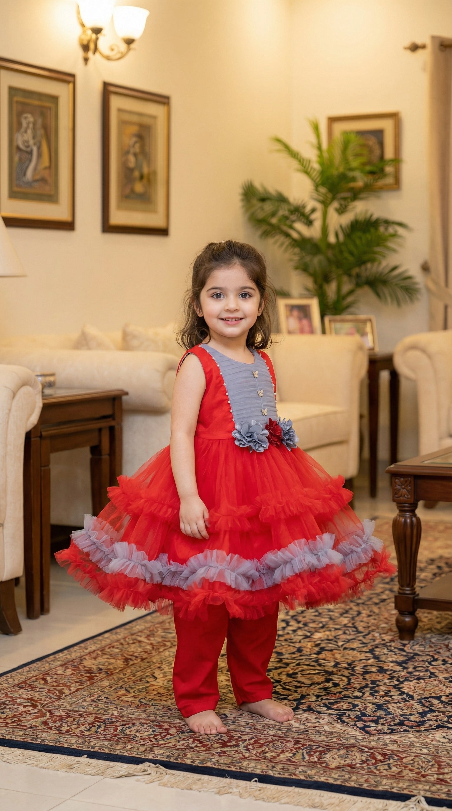 Transform her into a fairy-tale princess with our Whimsical Butterfly Ruffle Set. This enchanting outfit features a voluminous, multi-tiered soft net skirt adorned with delicate ruffles and contrasting trim, making it a perfect choice for birthdays, weddings, and festive celebrations.